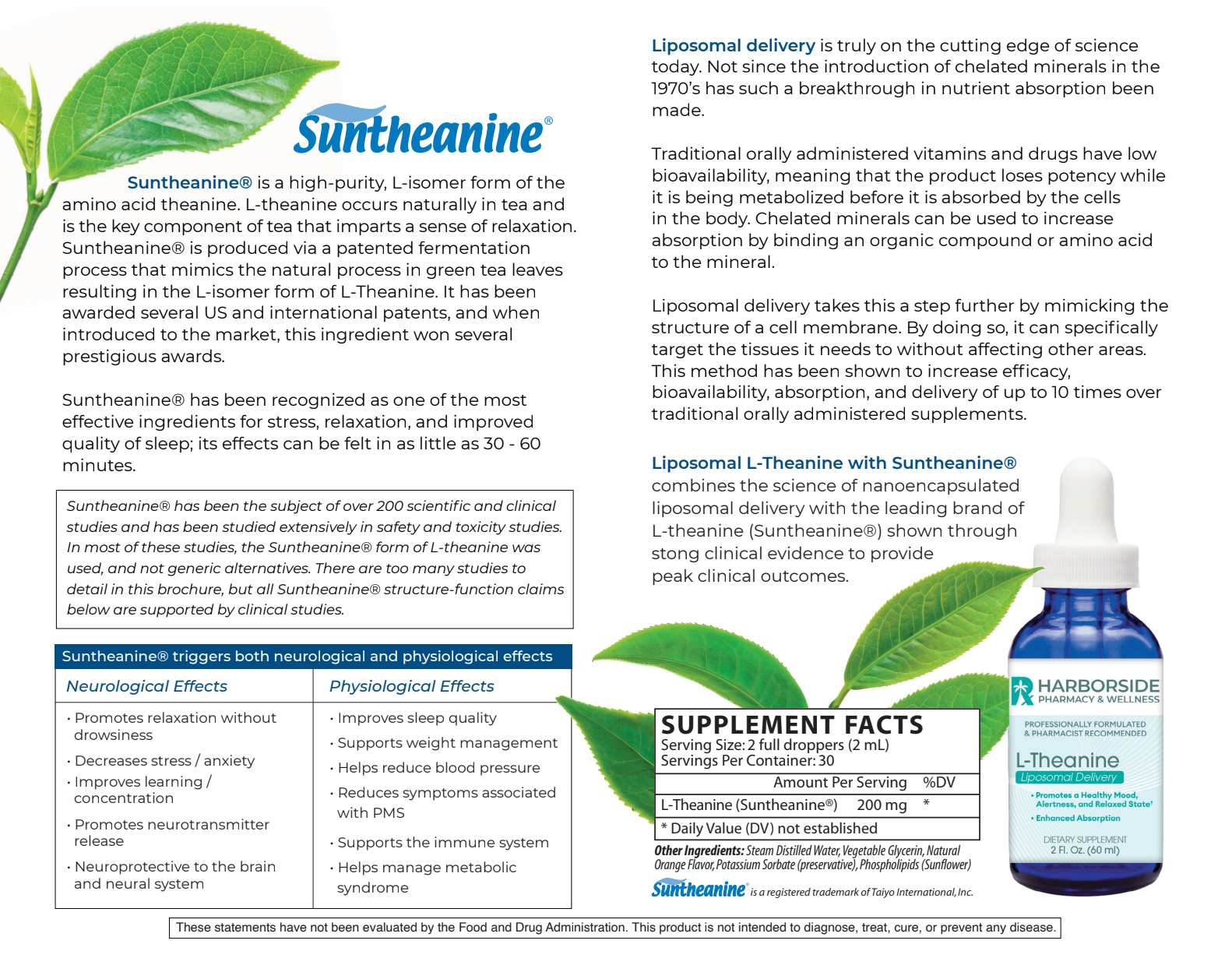 Harborside Pharmacy L-Theanine contains Suntheanine®, the purest form of L-Theanine on the market, which is produced through a patented process that mimics the natural process of green tea leaves. We have combined this patented and award winning ingredient with the science of our nanoencapsulated liposomal delivery for ultimate absorption and clinical outcomes.