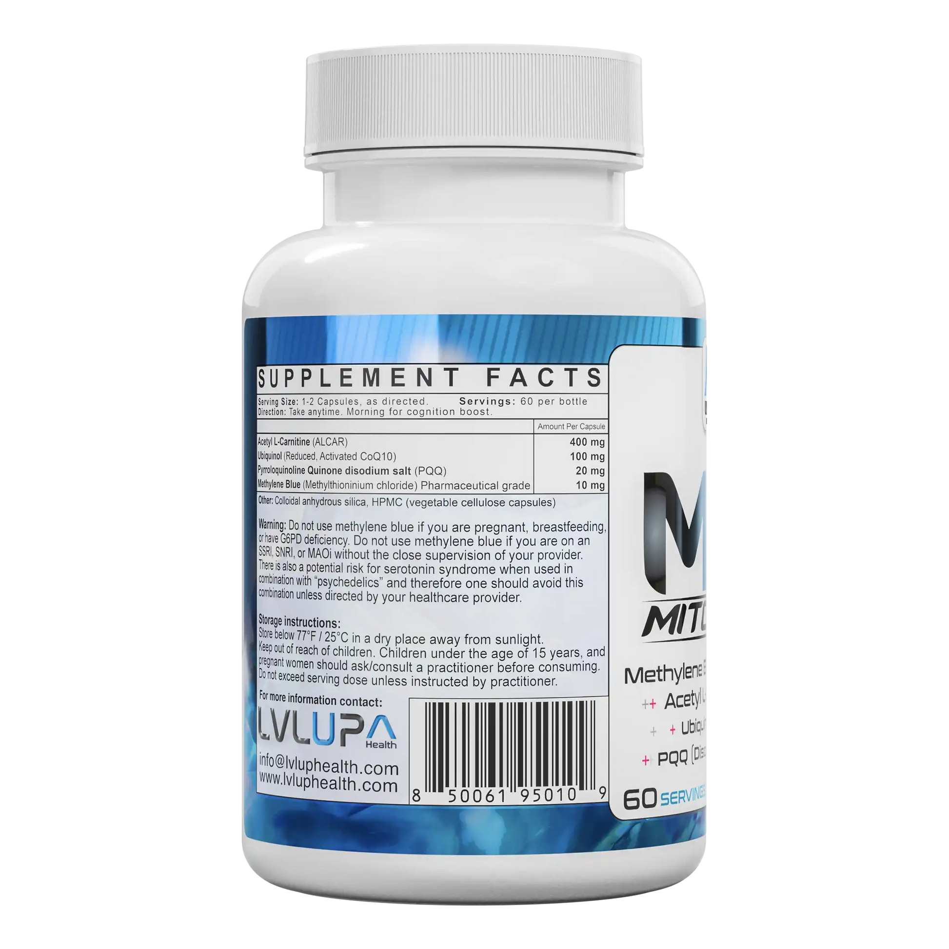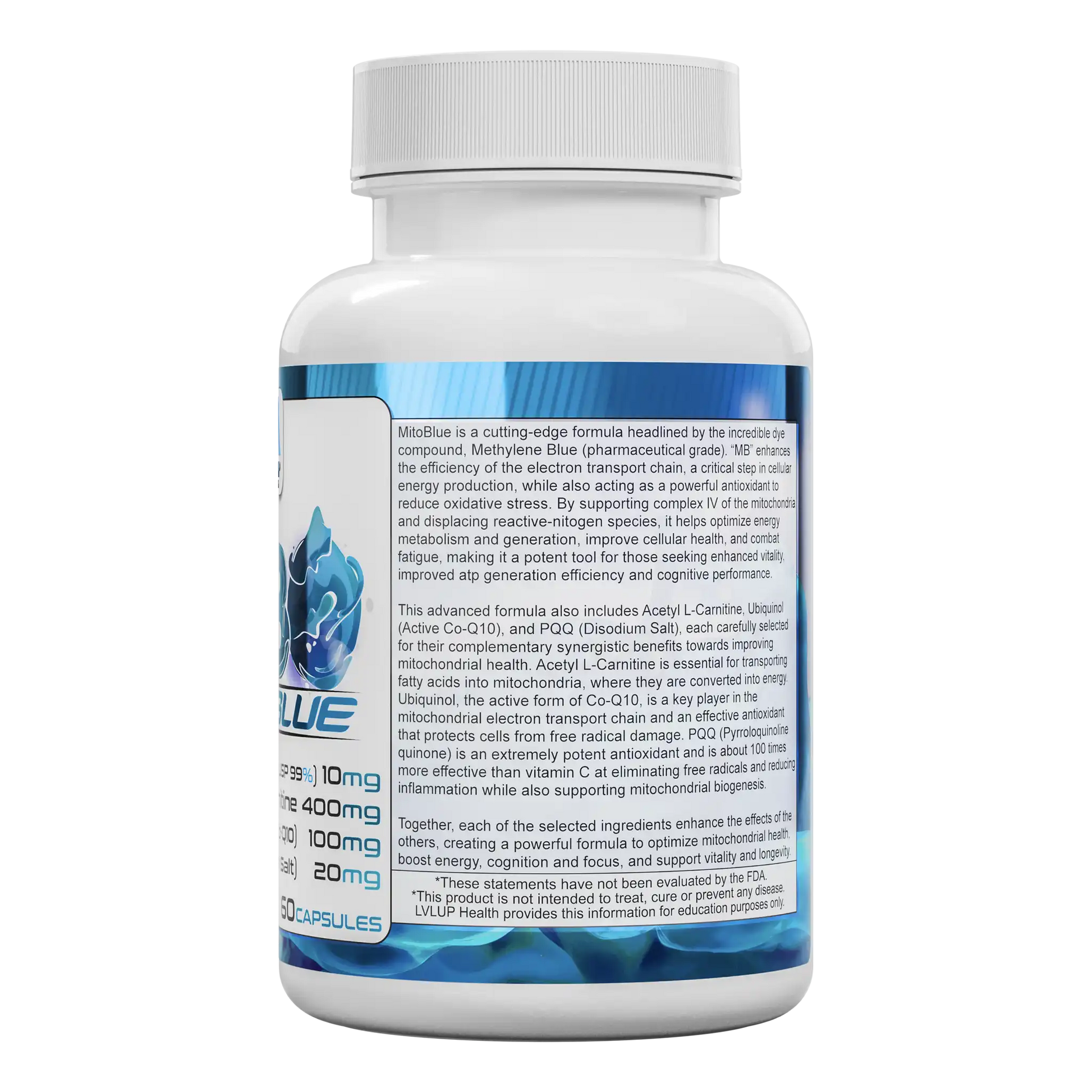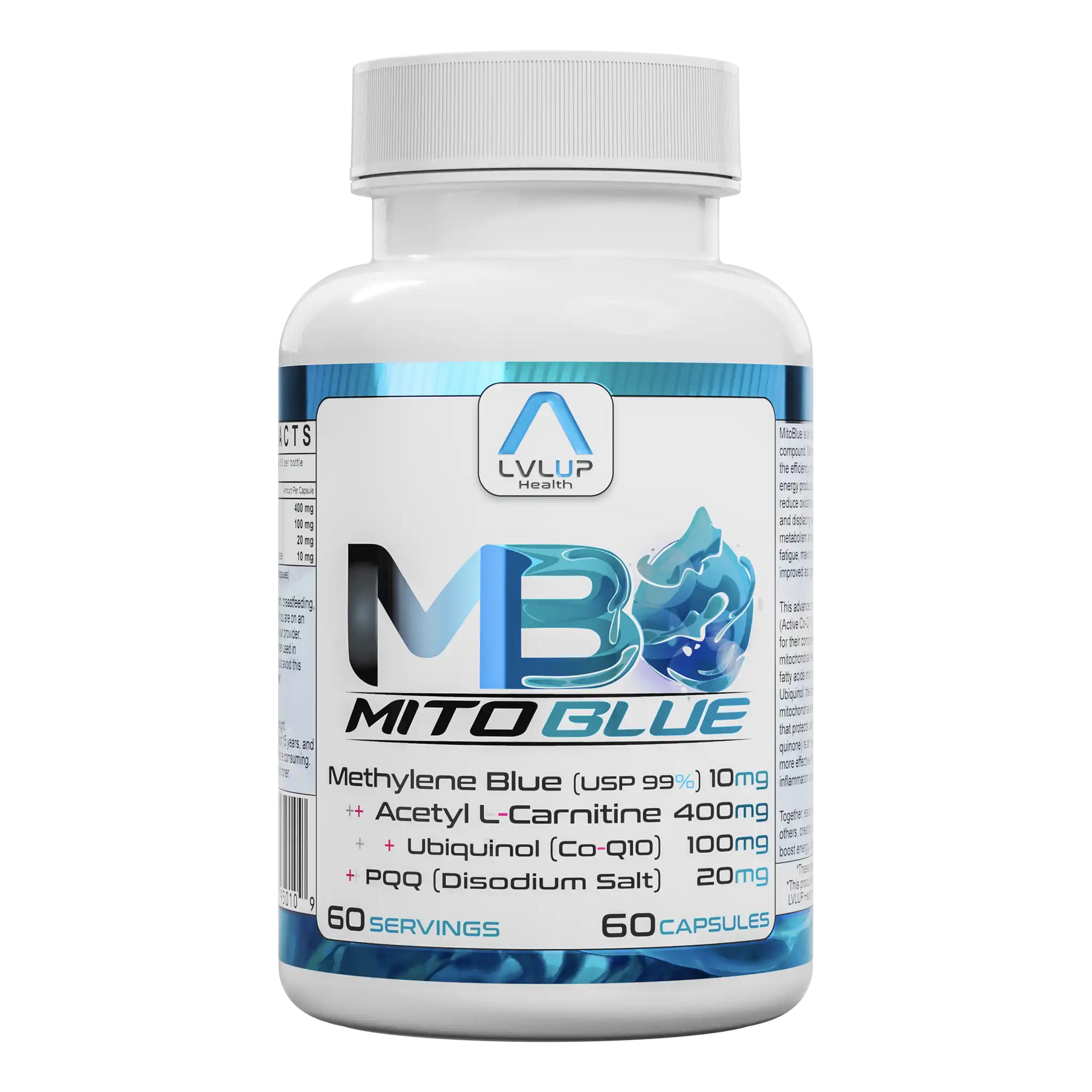 Mito Blue by LVLUP Health is designed for those seeking sharper focus, steady energy, and long-term cellular resilience. This formula combines pharmaceutical-grade Methylene Blue, Acetyl L-Carnitine, Ubiquinol, and PQQ in precisely calibrated doses. Methylene Blue supports efficient mitochondrial respiration and redox balance – key for brain and mood. Acetyl L-Carnitine drives fatty acid utilization, while Ubiquinol provides antioxidant protection and ATP support. PQQ stimulates new mitochondria generation. Together, these ingredients reinforce the body’s core energy systems, offering daily support for physical performance and cognitive clarity.