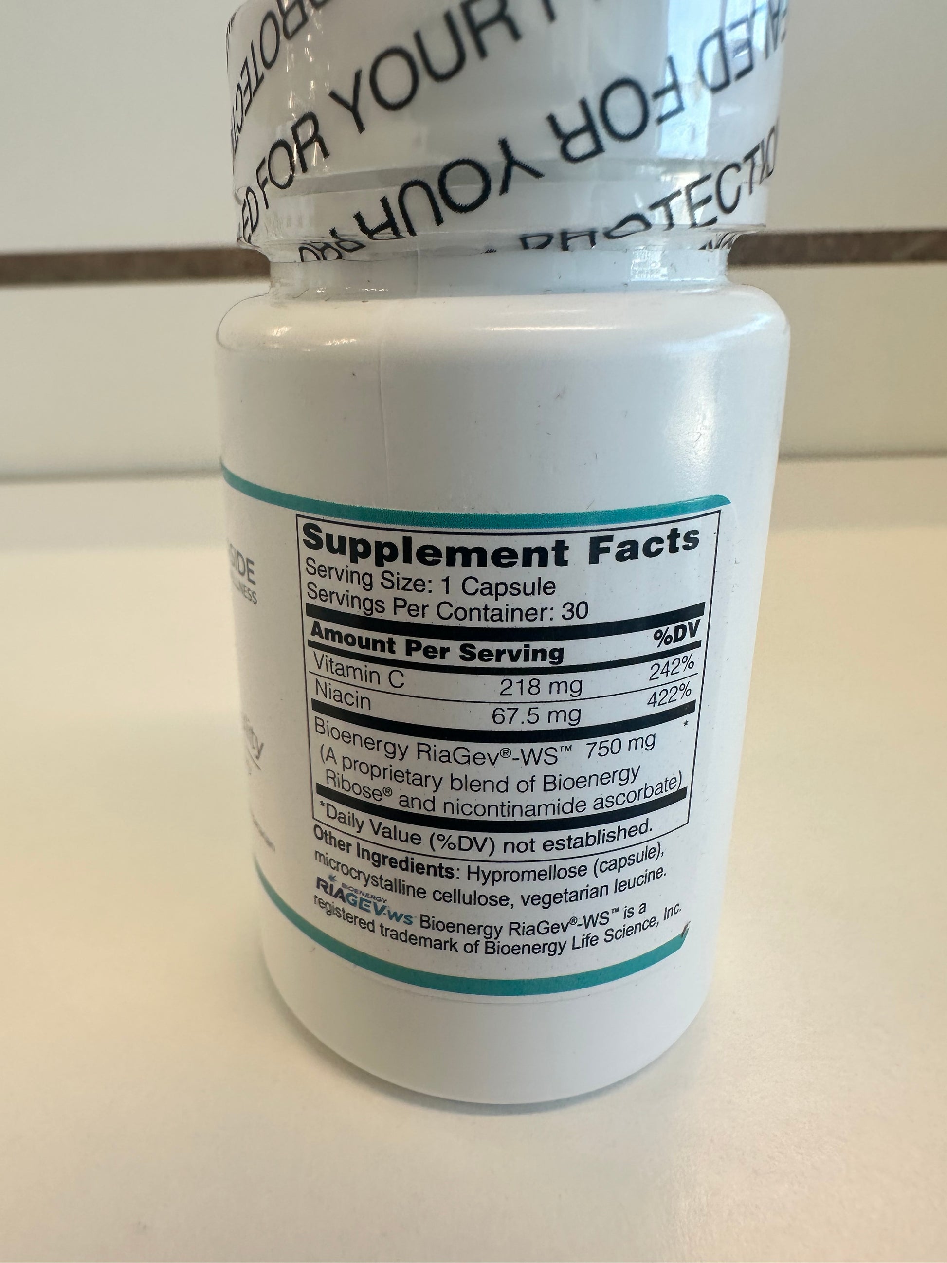 1 Vegetarian Capsule Contains: Vitamin C ........................................................... 218 mg Niacin................................................................. 67.5 mg Bioenergy RiaGev®-WS™................................ 750 mg (A proprietary blend of Bioenergy Ribose® and nicotinamide ascorbate)